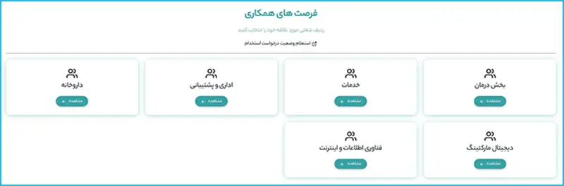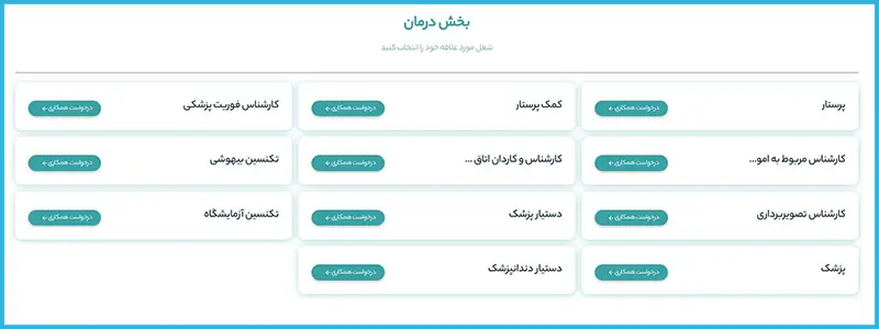 پس از انتخاب ردیف شغلی مدنظر، فهرست فرصتهای شغلی فعال نمایش داده میشود؛ شغل موردنظر خود را انتخاب کرده و بر روی گزینه «درخواست همکاری» کلیک نمایید.