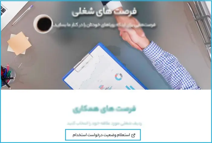 نکته: متقاضیان توجه داشته باشند پس از تکمیل و ثبت فرم، میتوانند با مراجعه به صفحه «فرصتهای شغلی» و انتخاب گزینه «استعلام وضعیت درخواست استخدام»، با وارد کردن کد ملی و شماره تلفن خود، از وضعیت فرم استخدامی مطلع شوند.