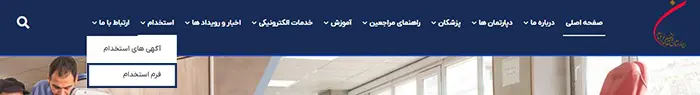 پس از ورود به سایت اصلی بیمارستان نورافشار، از منوی سربرگ سایت گزینه «استخدام» را انتخاب کرده و سپس بر روی گزینه «فرم استخدام» کلیک نمایید.