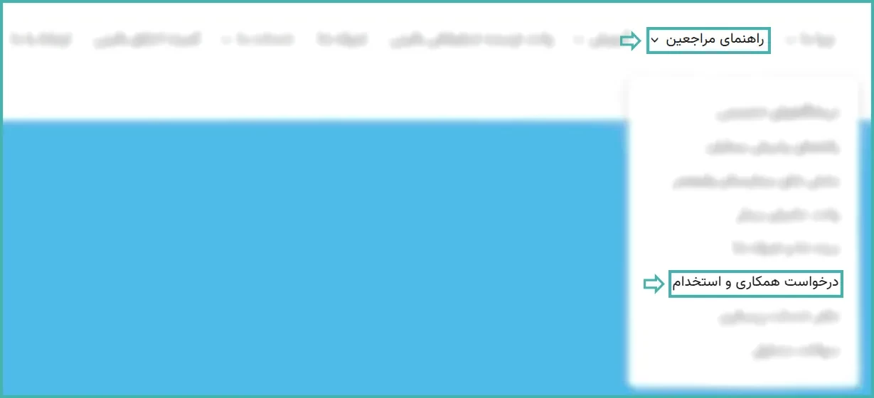 پس از ورود به سایت اصلی این بیمارستان، از نوار بالای صفحه گزینه "راهنمای مراجعین" را انتخاب کرده و سپس در منوی بازشده روی "درخواست همکاری و استخدام" کلیک نمایید.