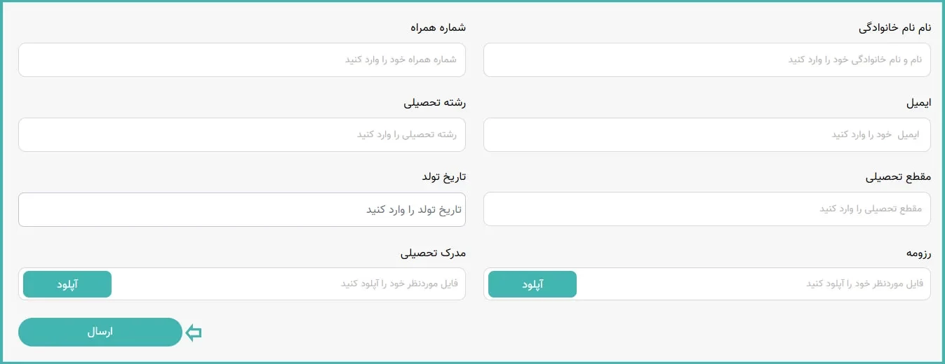 پس از کلیک روی گزینه درخواست همکاری و استخدام، صفحهای مشابه تصویر زیر در قالب فرم استخدام نمایش داده می شود که باید در آن اطلاعاتی مانند نام و نام خانوادگی، شماره همراه، ایمیل و.. را وارد کرده سپس فایل رزومه و مدرک تحصیلی خود را در بخش مربوطه بارگذاری کرده و در پایان روی دکمه "ارسال" کلیک نمایید.