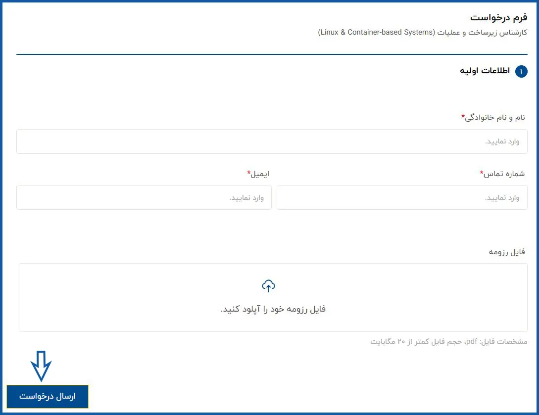 پس از کلیک بر روی "ارسال درخواست"، وارد صفحه فرم استخدام خواهید شد. در این مرحله، لازم است اطلاعات هویتی خود شامل نام و نام خانوادگی، شماره تماس، آدرس ایمیل، تاریخ تولد و سایر موارد خواستهشده را تکمیل نمایید. در بخش انتهایی این صفحه، فایل رزومه خود را بارگذاری کرده و سپس بر روی گزینه "ارسال درخواست" کلیک کنید.
