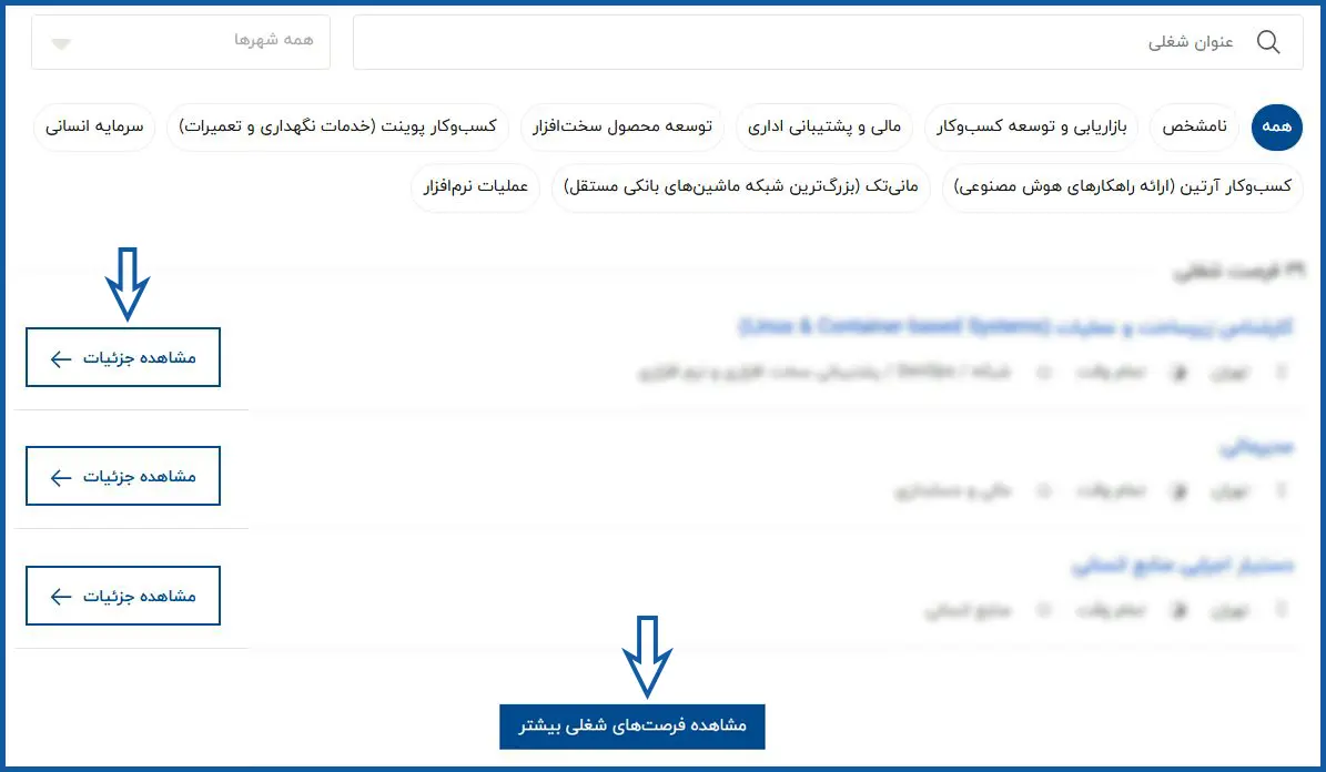 نکته: همچنین برای مشاهده تمامی فرصتهای شغلی، میتوانید بر روی دکمه "مشاهده فرصتهای شغلی بیشتر" که در تصویر زیر نمایش داده شده است، کلیک نمایید.