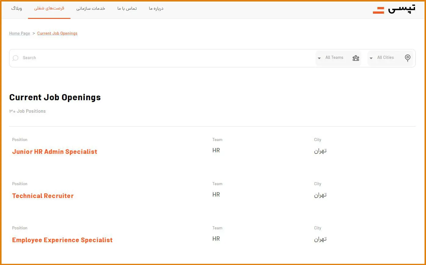 ابتدا وارد سایت رسمی تپسی شوید. در پایین صفحه اصلی، گزینه «فرصتهای شغلی» قرار دارد. با انتخاب این بخش به صفحه فرصتهای استخدامی منتقل میشوید.