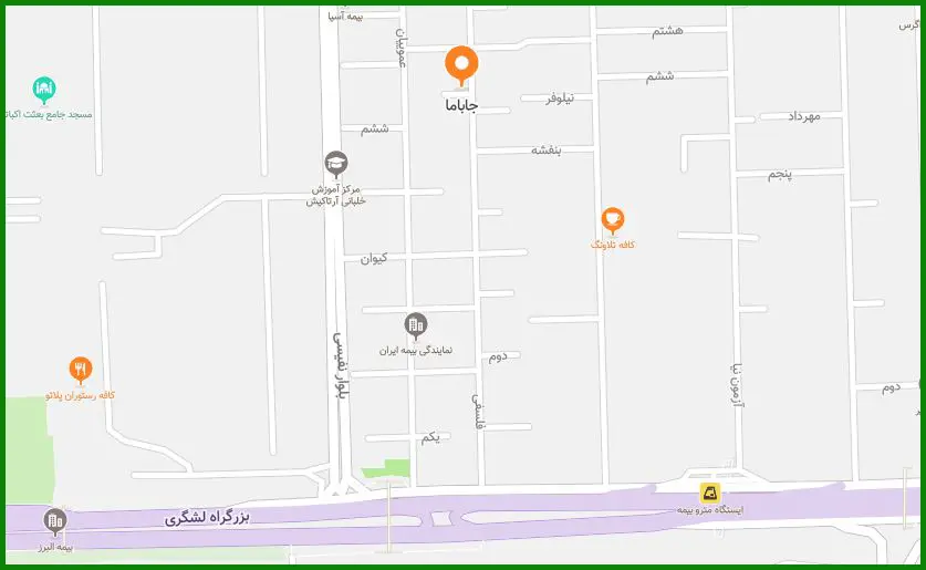 آدرس: اکباتان، نبش اتوبان لشگری، کوی بیمه، خیابان بیمه چهارم، بنبست گلها، پلاک ۱