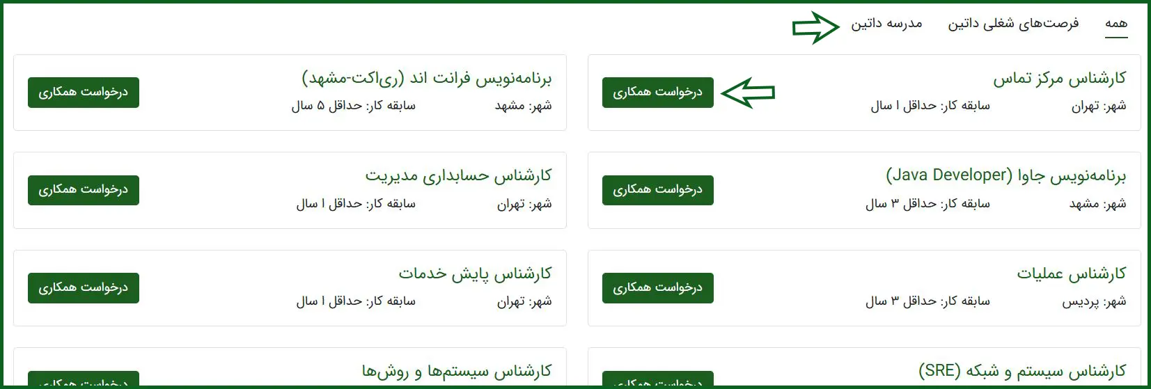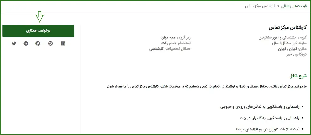 پس از ورود به صفحه توضیحات شغل، شرایط و توضیحات را بهدقت مطالعه کرده و سپس از سمت چپ صفحه روی گزینه «درخواست همکاری» کلیک نمایید.