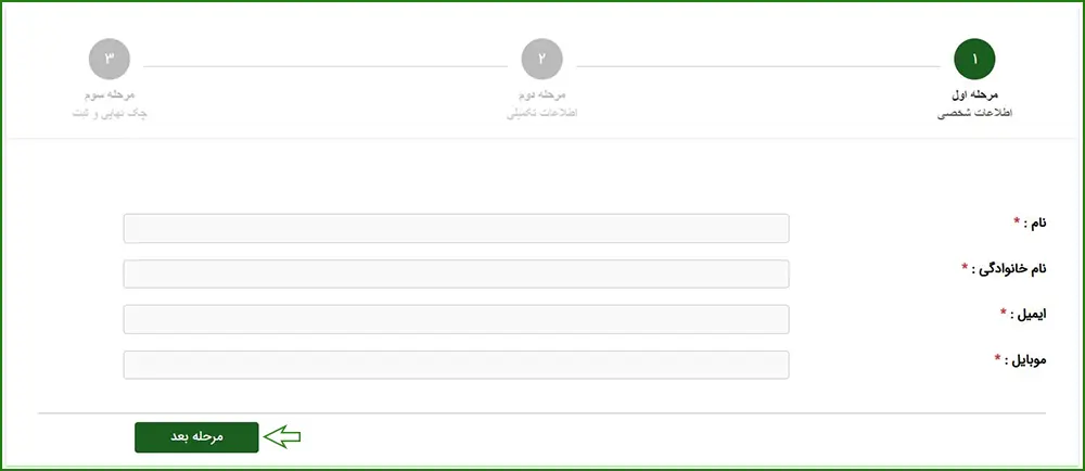 در فرم استخدام، اطلاعات هویتی خود شامل نام و نام خانوادگی، شماره تماس و ایمیل را وارد کرده و پس از بررسی صحت اطلاعات، روی گزینه «مرحله بعد» کلیک کنید.