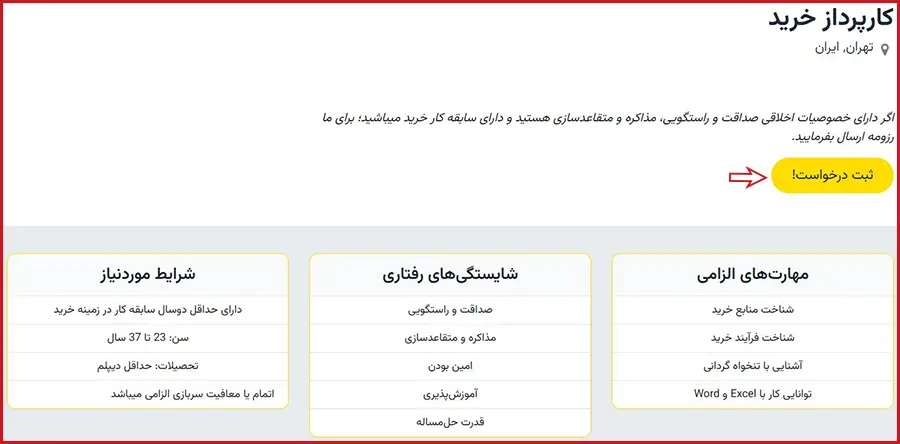 پس از انتخاب شغل، مهارتها، شایستگیهای رفتاری و شرایط مورد نیاز را مطالعه کنید. در صورت تطابق با شرایط، روی دکمه «ثبت درخواست» کلیک نمایید.