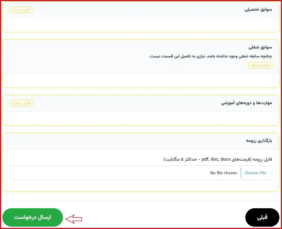 سوابق تحصیلی و شغلی خود را به طور کامل وارد کنید. در صورت داشتن مهارتها و دورههای آموزشی مرتبط، آنها را نیز اضافه نمایید. در نهایت رزومه خود را بارگذاری کرده و روی دکمه «ارسال درخواست» کلیک کنید.