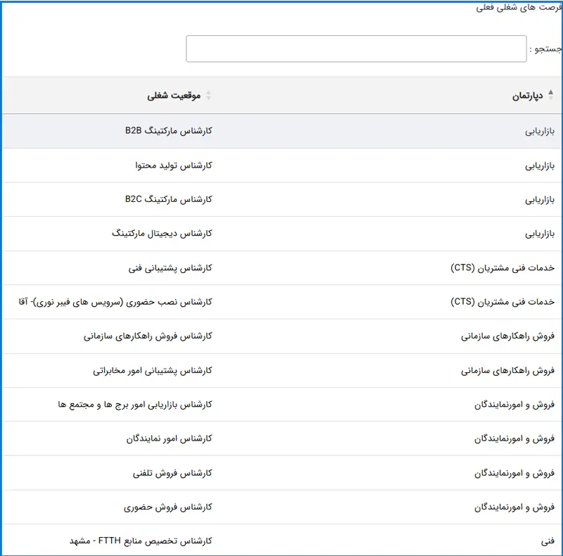 پس از کلیک روی گزینه فرصتهای شغلی، فهرستی از موقعیتهای شغلی فعال نمایش داده میشود که میتوانید فرصت شغلی موردنظر را جستجو کرده و روی شغل موردنظر کلیک نمایید.
