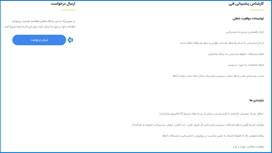 پس از بررسی توضیحات شغلی و اطمینان از تطابق آن با مهارتها و سوابق کاری خود، روی گزینه "ارسال درخواست" کلیک نمایید.