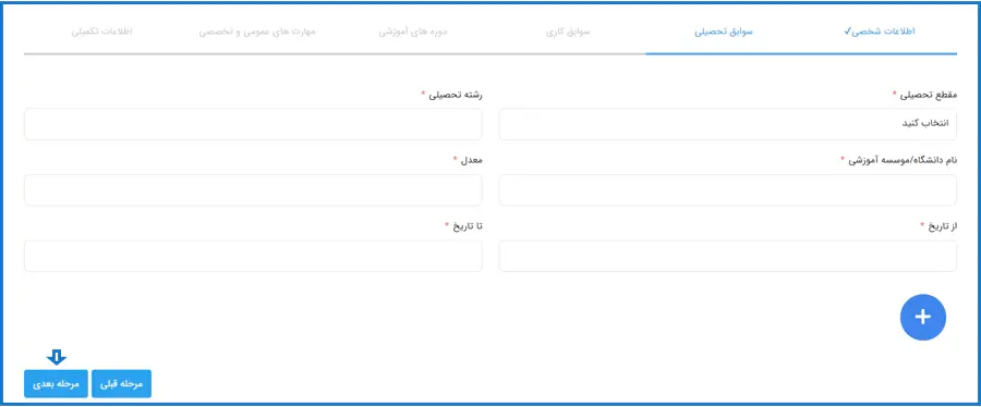 مرحله پنجم، مربوط به اطلاعات سوابق تحصیلی است که باید در آن مقطع و رشته تحصیلی، نام دانشگاه/موسسه آموزشی، معدل و.. را وارد کرده و روی دکمه "مرحله بعدی" کلیک نمایید.