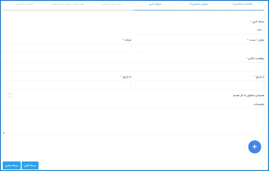 در این مرحله در صورت داشتن سابقه کاری، اطلاعاتی نظیر عنوان، نام شرکت، موقعیت مکانی و.. را وارد نمایید.