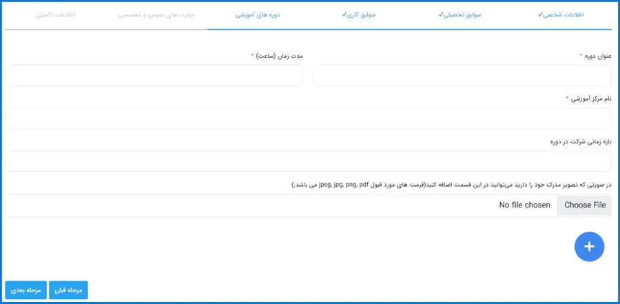 مرحله هفتم مربوط به سوابق دورههای آموزشی است که لازم است اطلاعاتی نظیر عنوان دوره، مدت زمان، نام مرکز آموزشی و .. را وارد کرده سپس در صورتی که تصویر مدرک خود را دارید آنرا بارگذاری نمایید.