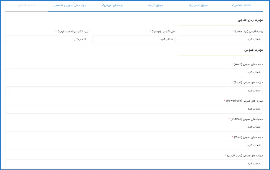 در این مرحله، مهارتهای زبان خارجی و مهارت های عمومی خود را از بین گزینههای موجود انتخاب کرده سپس سایر مهارتها و سوابق علمی و .. را وارد نمایید.