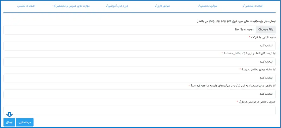 در صورت داشتن رزومه آنرا بارگذاری کنید سپس اطلاعاتی مانند نحوه آشنایی با شرکت، بستگان شاغل خود در شرکت، سابقه بیماری و.. را از بین گزینههای موجود انتخاب کرده و روی دکمه "ارسال" کلیک نمایید.