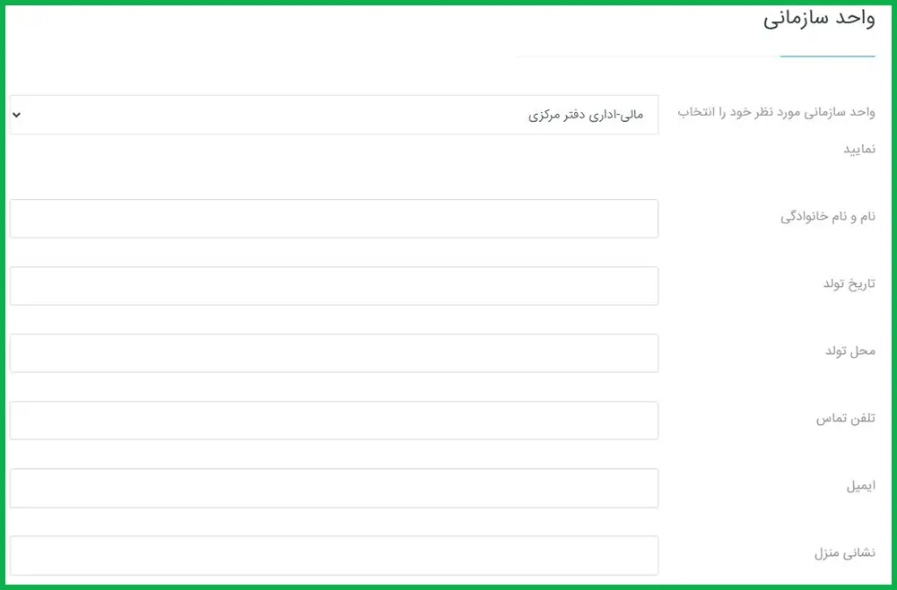 پس از کلیک بر روی گزینه دعوت به همکاری، وارد صفحه فرم استخدام میشوید. سپس نیاز است واحد سازمانی درخواستی خود را انتخاب کرده و اطلاعات هویتی نظیر نام و نام خانوادگی، تاریخ تولد، محل تولد، تلفن تماس و... را طبق موارد خواسته شده تکمیل نمایید.