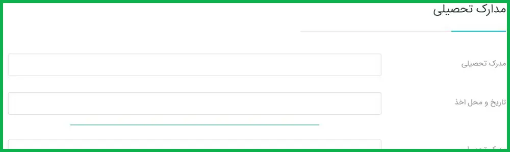 در این مرحله، نیاز است اطلاعات تحصیلی خود نظیر مدرک تحصیلی، تاریخ و محل اخذ مدرک و... خود را وارد نمایید.