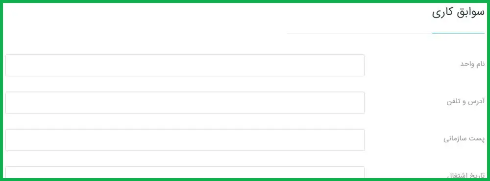 در این بخش، متقاضیان محترم باید سوابق شغلی خود را به ترتیب از آخرین محل فعالیت (جدیدترین به قدیمیترین) ثبت نمایند؛ برای این منظور، درج دقیق نام واحد یا شرکت سابق، اطلاعات تماس آن جهت استعلام، عنوان پست سازمانی شما در آن مجموعه و بازه زمانی شروع و پایان همکاری الزامی است.