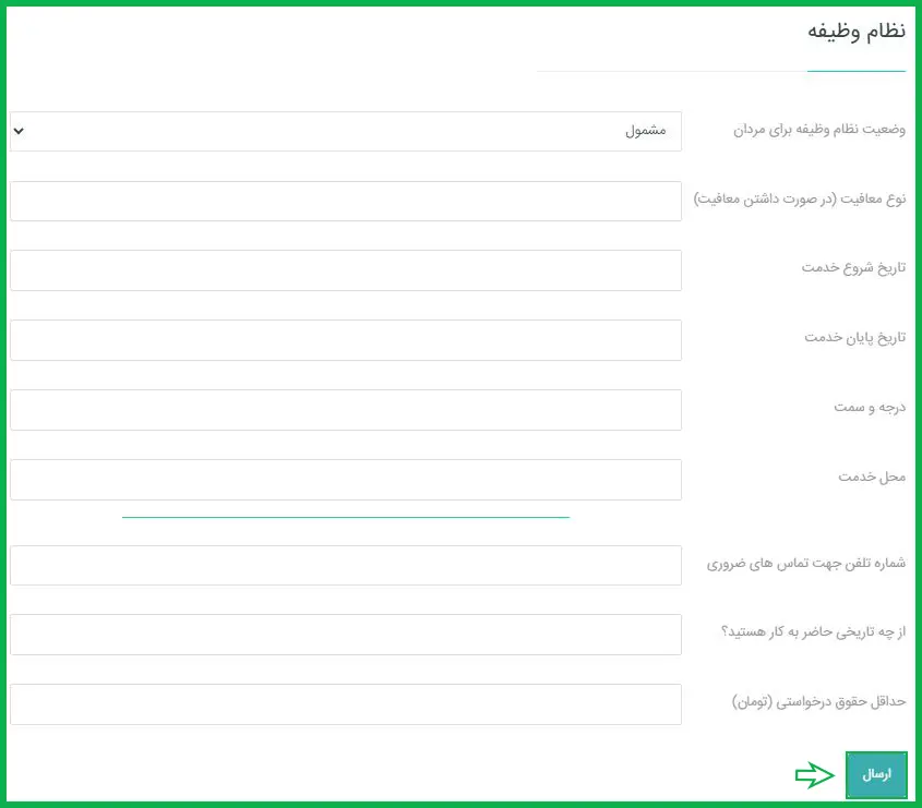 در این مرحله، در صورت انجام نظام وظیفه، اطلاعاتی نظیر وضعیت نظام وظیفه، نوع معافیت، تاریخ شروع و پایان خدمت، محل خدمت و... را وارد نمایید و سپس بر روی گزینه «ارسال» کلیک نمایید.