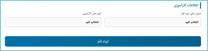 در این بخش، عنوان شغلی مورد نظر و شهر محل انجام کارآموزی را انتخاب نمایید. پس از تکمیل اطلاعات، برای ثبت نهایی درخواست بر روی دکمه «ثبت نام» کلیک کنید.