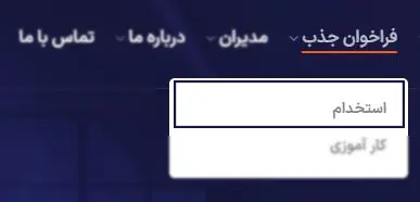 پس از ورود به سایت اصلی این شرکت، از نوار بالای صفحه، گزینه "فراخوان جذب" را انتخاب کرده و در منوی بازشده، روی "استخدام" کلیک نمایید.