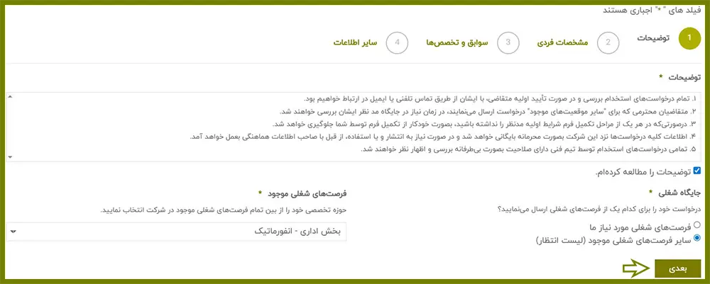 در این مرحله، پس از کلیک بر روی گزینه درخواست استخدام، وارد صفحه فرم استخدام میشوید. سپس نیاز است توضیحات را مطالعه کرده و تیک گزینه «توضیحات را مطالعه کردهام» را فعال کنید. همچنین باید جایگاه شغلی خود را هم انتخاب کنید. به دو صورت جایگاه شغلی خود را میتوانید انتخاب نمایید: