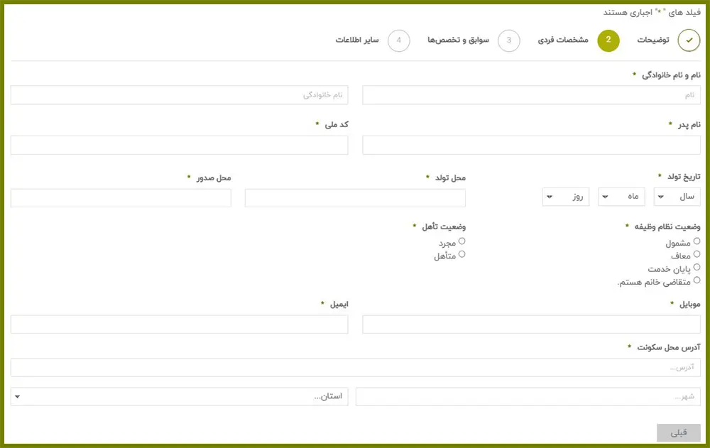 در این بخش، نیاز است اطلاعات هویتی خود نظیر نام و نام خانوادگی، نام پدر، کدملی، شماره تماس و... را تکمیل کرده، سپس بر روی گزینه «بعدی» کلیک نمایید.