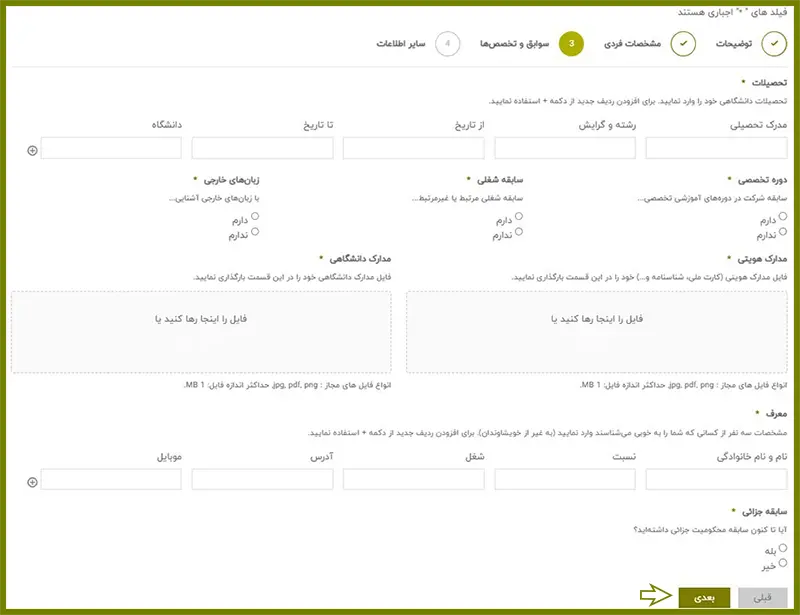 در این مرحله، نیاز است سوابق، تخصصها و... را طبق موارد خواسته شده تکمیل کرده و مدارک خود را بارگذاری کنید، سپس بر روی گزینه «بعدی» کلیک نمایید.