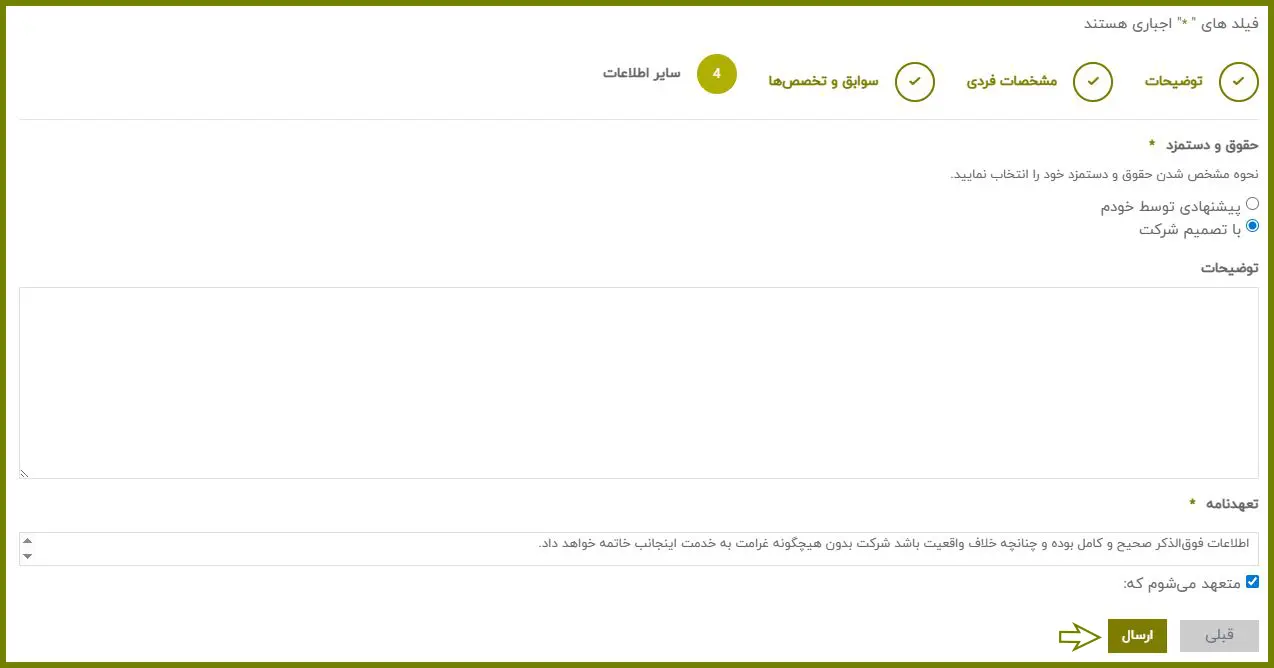 در این بخش موارد خواسته شده مانند: حقوق و دستمزد، تعهدنامه و... را تکمیل کرده، سپس بر روی گزینه «ارسال» کلیک نمایید.