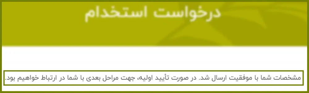 در نهایت، پس از تکمیل فرم استخدام و کلیک بر روی گزینه «ارسال»، پیام تأیید مطابق تصویر زیر نمایش داده میشود. مشاهده پیام زیر به این معناست که فرم شما در صف بررسی کارشناسان شرکت شاخه زیتون لیان قرار گرفته و در صورت تطابق فرم درخواست همکاری دریافت شده با شرایط شغل مورد نظر، با شما تماس گرفته خواهد شد.