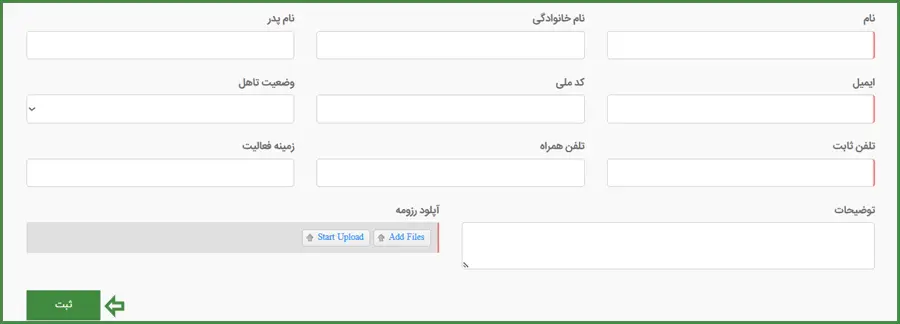 پس از کلیک روی گزینه مربوطه، صفحهای مشابه تصویر زیر در قالب فرم استخدام نمایش داده میشود که در آن باید اطلاعاتی مانند نام و نام خانوادگی، نام پدر، کد ملی و.. را وارد کنید، سپس فایل رزومه خود را در بخش مربوطه بارگذاری کرده و در پایان روی دکمه "ثبت" کلیک نمایید.