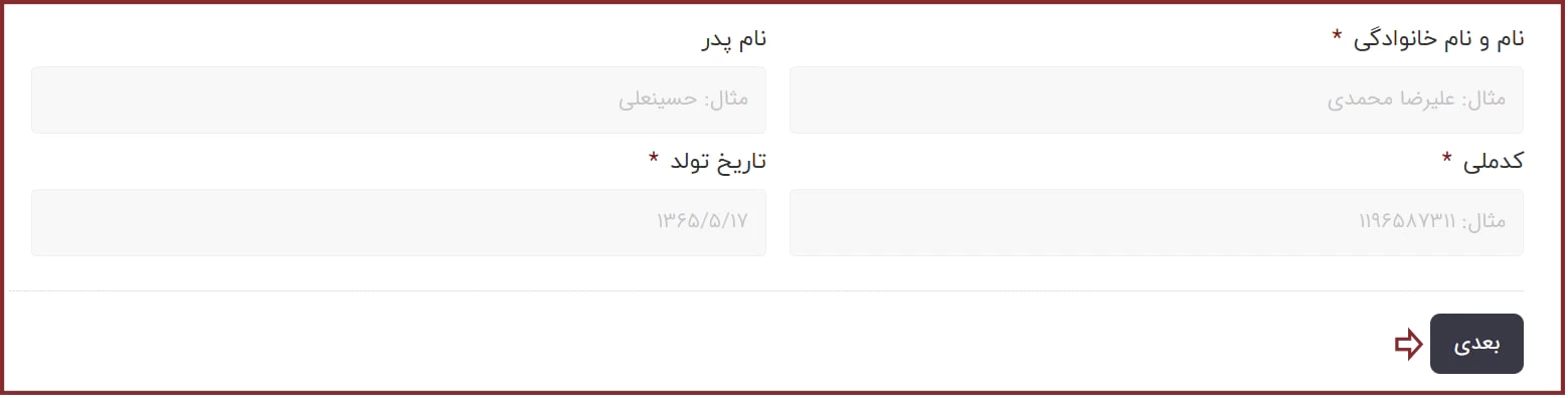 پس از کلیک روی گزینه فرم همکاری، صفحهای مشابه تصویر زیر نمایش داده میشود که در آن باید اطلاعات هویتی خود، از جمله نام و نام خانوادگی، نام پدر، کد ملی و تاریخ تولد را وارد کرده و سپس روی دکمه "بعدی" کلیک نمایید.