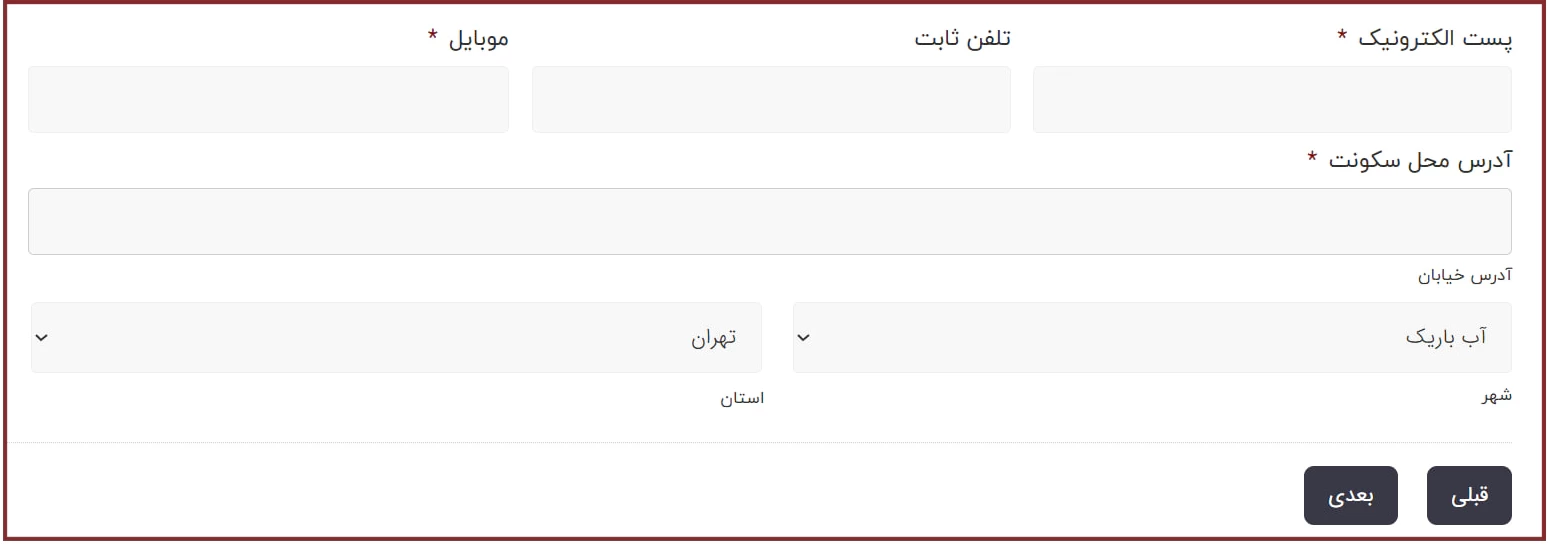 در این مرحله باید اطلاعات تماس خود، از جمله پست الکترونیک، شماره موبایل، آدرس محل سکونت و.. را وارد نمایید.