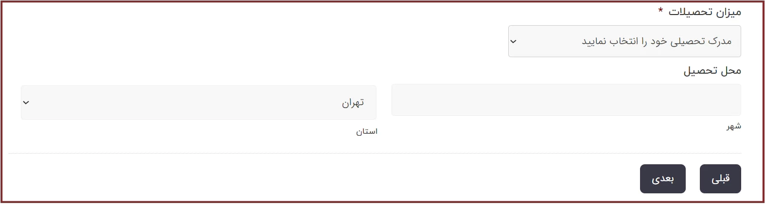 این مرحله مربوط به اطلاعات سوابق تحصیلی شما است که ابتدا باید میزان تحصیلات خود را انتخاب کنید، سپس میتوانید شهر و استان محل تحصیل خود را وارد نمایید.