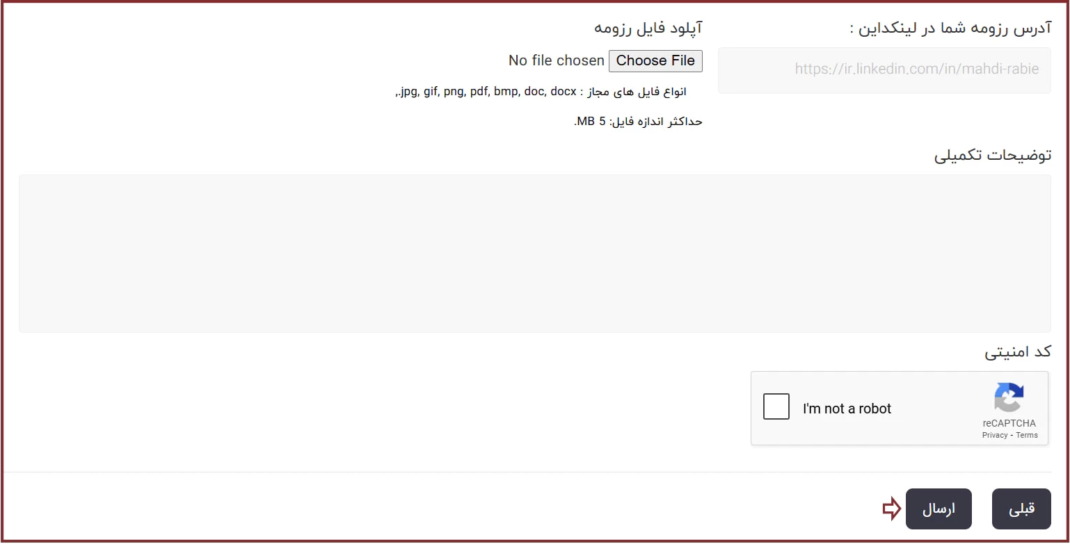 در این مرحله میتوانید ابتدا آدرس رزومهی خود در لینکدین را وارد کرده و در صورت داشتن فایل رزومه، آن را نیز آپلود نمایید. سپس در بخش توضیحات، هر نکته یا توضیح ضروری را درج کنید و در پایان با فعال کردن تیک گزینهی کد امنیتی، روی دکمه "ارسال" کلیک نمایید.