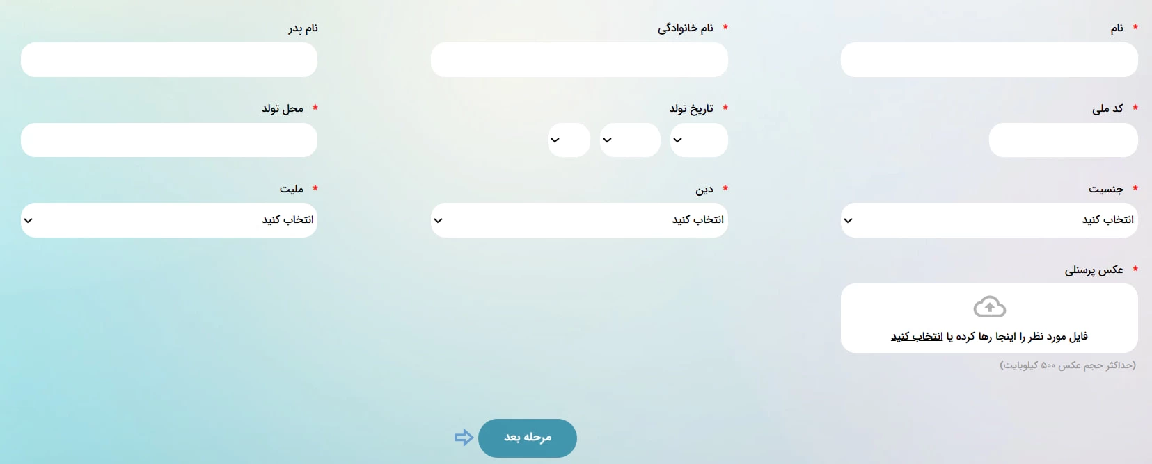 پس از کلیک روی گزینه دعوت به همکاری، صفحهای مشابه تصویر زیر در قالب فرم استخدام نمایش داده میشود که در آن باید اطلاعات هویتی خود شامل نام و نام خانوادگی، کد ملی، تاریخ تولد و.. را وارد کرده و سپس روی دکمه "مرحله بعد" کلیک نمایید. توجه داشته باشید تکمیل فیلدهایی که با ستاره مشخص شدهاند الزامی است.