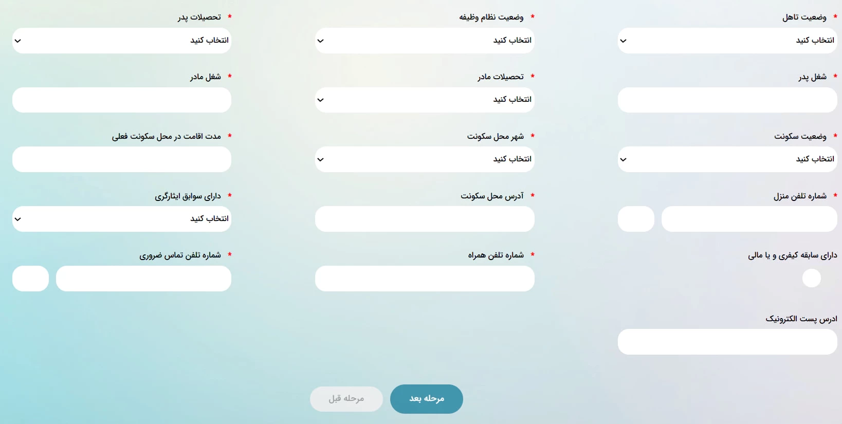 در این مرحله از فرم، باید اطلاعاتی نظیر وضعیت تأهل، وضعیت نظام وظیفه، وضعیت محل سکونت و.. را وارد نمایید.