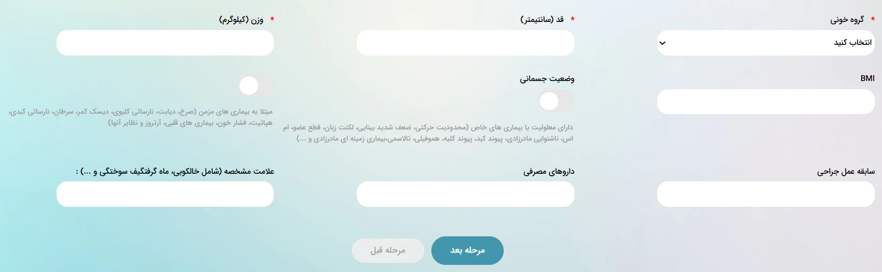 این مرحله مربوط به مشخصات ظاهری شما است که باید در آن اطلاعاتی مانند گروه خونی، قد، وزن و.. را وارد نمایید.