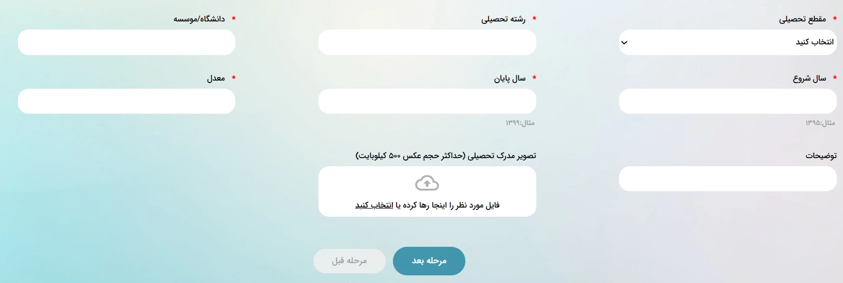 در این مرحله، ابتدا باید مقطع تحصیلی خود را از میان گزینههای موجود انتخاب کنید. سپس رشته تحصیلی، نام دانشگاه، سال شروع و پایان تحصیل و.. را وارد نمایید. در صورت تمایل، میتوانید تصویر مدرک تحصیلی خود را نیز در بخش مربوطه بارگذاری کنید.