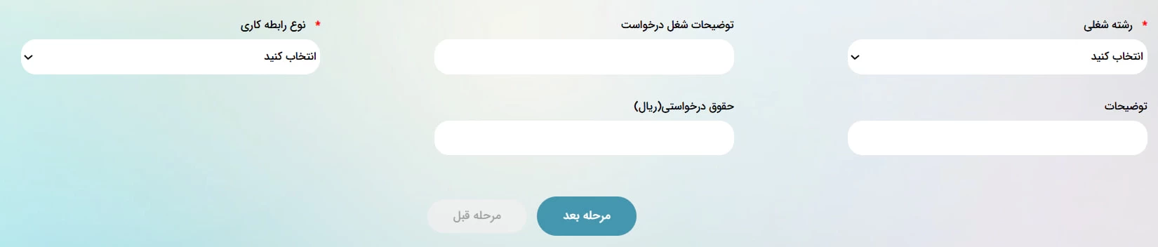 این مرحله مربوط به اطلاعات شغلی شما است. در این بخش باید رشته شغلی موردنظر خود را از میان گزینههای موجود انتخاب کنید. سپس میتوانید توضیحات شغل درخواستی، نوع رابطه کاری، میزان حقوق درخواستی و سایر توضیحات مرتبط را وارد نمایید.