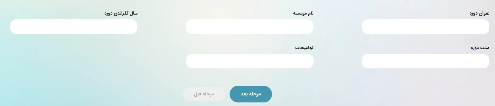 در این بخش از فرم، میتوانید اطلاعات مربوط به دورههای آموزشی گذراندهشده شامل عنوان دوره، نام مؤسسه برگزارکننده، مدت زمان دوره و سایر جزئیات مرتبط را وارد نمایید.