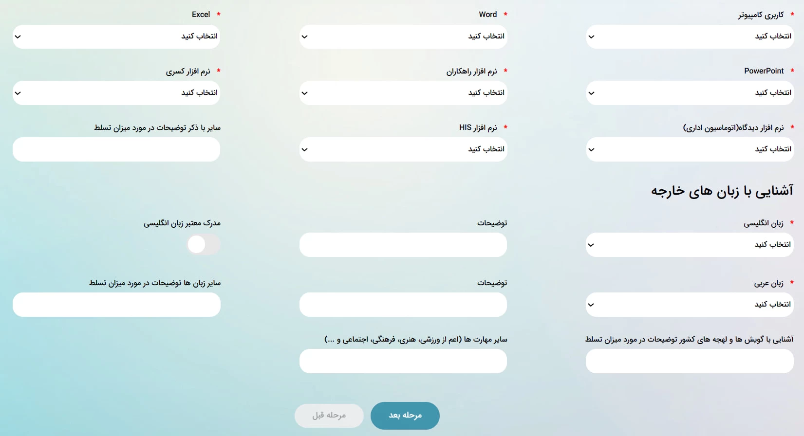 در این مرحله، باید میزان آشنایی خود با مهارتهای رایانهای از جمله کاربری کامپیوتر، Word، Excel، PowerPoint و نرمافزارهای تخصصی را از بین گزینههای موجود انتخاب نمایید. سپس در بخش پایین، اطلاعات مربوط به سطح تسلط خود بر زبانهای خارجی از جمله انگلیسی و عربی را وارد کنید.