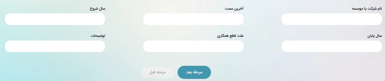 در این مرحله میتوانید اطلاعات مربوط به سوابق شغلی خود از جمله نام شرکت یا مؤسسه، عنوان آخرین سمت شغلی، سال شروع و پایان همکاری و.. را وارد نمایید.