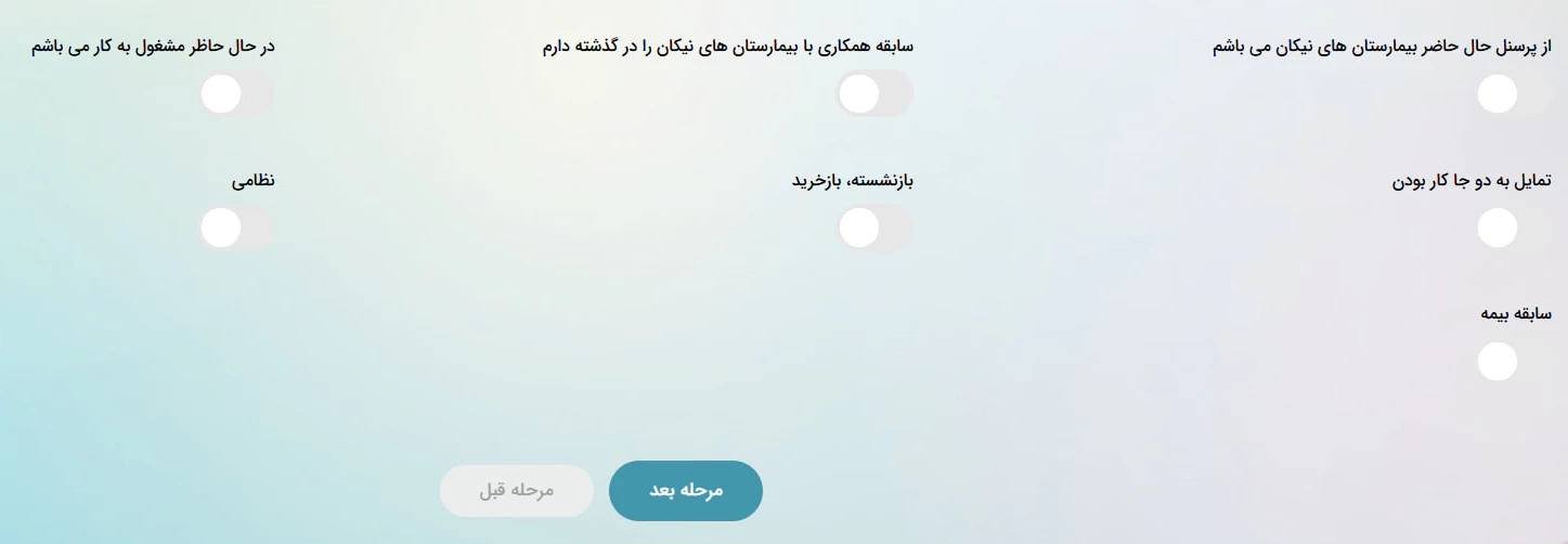 در این بخش از فرم، میتوانید گزینههای مرتبط با وضعیت شغلی خود از جمله اشتغال فعلی، سابقه همکاری با بیمارستانهای نیکان، عضویت در کادر فعلی بیمارستان نیکان و.. را انتخاب نمایید.