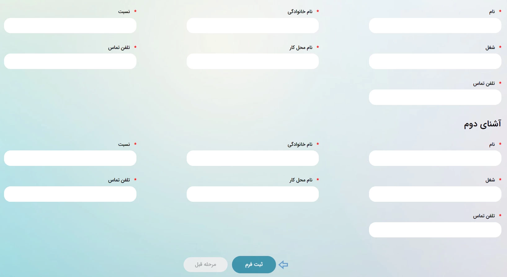در این مرحله باید اطلاعات دو نفر از آشناهای خود از جمله نام و نام خانوادگی، نسبت فامیل، شغل و.. را وارد کرده سپس روی دکمه "ثبت فرم" کلیک نمایید.