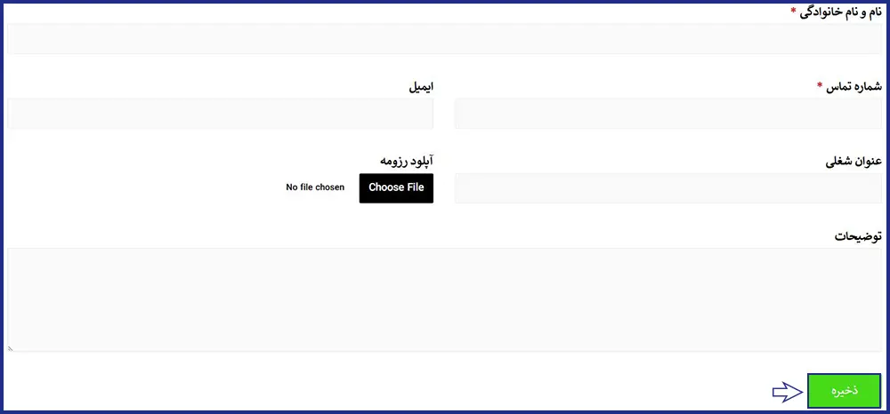 در این مرحله، پس از کلیک بر روی گزینه درخواست همکاری، وارد صفحه فرم استخدام میشوید. سپس نیاز است اطلاعات هویتی خود نظیر نام و نام خانوادگی، ایمیل، شماره تماس و... را تکمیل کرده سپس بر روی گزینه «ذخیره» کلیک نمایید.