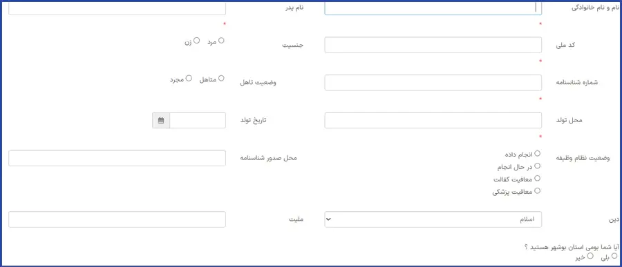 پس از کلیک روی گزینه مربوطه، صفحهای مشابه تصویر زیر در قالب فرم استخدام نمایش داده میشود که باید در آن اطلاعات هویتی خود شامل نام و نام خانوادگی، نام پدر، کد ملی و.. را وارد نمایید.