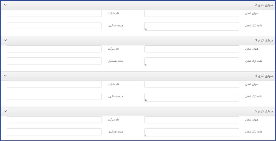 بخش چهارم مربوط به سوابق کاری است که می توانید در آن اطلاعاتی مانند عنوان شغل، نام شرکت، علت ترک شغل و مدت همکاری را وارد نمایید.