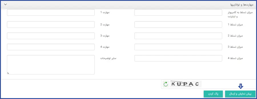 در این بخش میتوانید میزان تسلط خود را بر مهارتهای مختلف، از جمله کار با کامپیوتر و اینترنت و مهارتهای فردی وارد کنید. همچنین در قسمت سایر توضیحات، میتوانید توضیحات تکمیلی خود را درج نمایید. در پایان، کد امنیتی نمایش داده شده را وارد کرده و روی دکمه "پیش نمایش و ارسال" کلیک نمایید.
